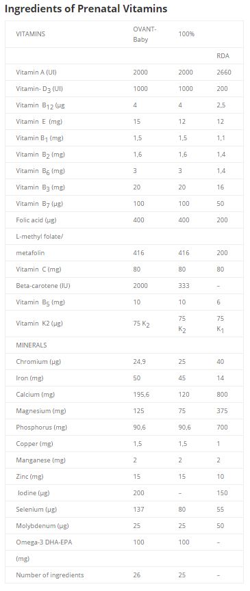Az OVANT-Baba 26 mikrotápanyagot tartalmaz: alapvető vitaminok/pro-vitaminok, folsav, nyomelemek, ásványi anyagok és Omega-3 zsírsavak. Az összetevők együtt támogatják a kismama egészségét, a magzat fejlődését. A tudományos kutatások és elemzések bizonyítják, hogy ezen mikrotápanyagok hiánya növeli a rendellenességek kockázatát a terhesség alatt és után. Az OVANT-Baba olyan kulcsfontosságú tápanyagokat tartalmaz, amelyek szükségesek mind a baba, mind a kismama számára a terhesség alatt és a szoptatás idején.